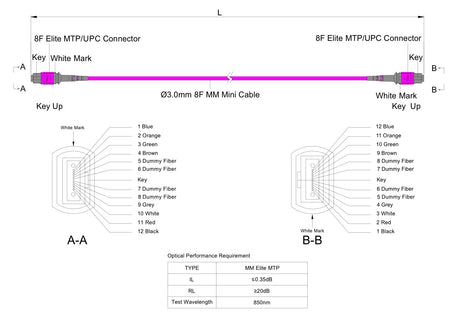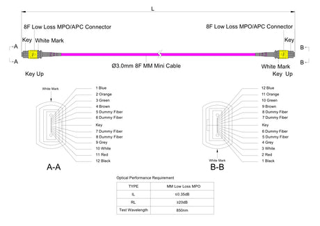 8芯低插損母頭 MPO/APC 轉母頭 MPO/APC 跳線 | 康寧® ClearCurve® OM4 多模光纖 | 極性B,黃色 MPO-12 接頭,洋紅色外被 | LSZH 低煙無鹵外被