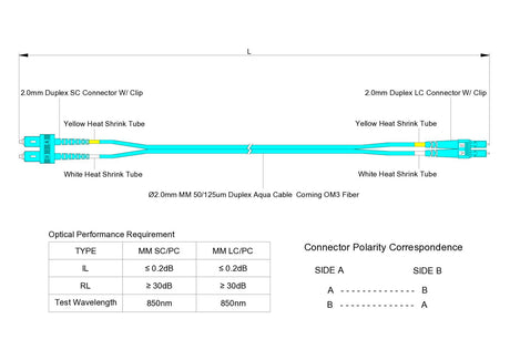 TAA合規 | 電信級 0.2dB LC/UPC to SC/UPC 多模 OM3 雙工光纖跳線 | 康寧纖芯 | 水綠色 OFNR 外被, 米色接頭