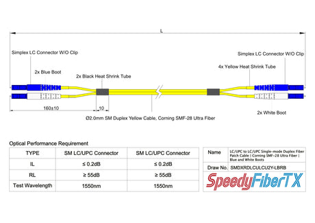 電信級 0.2dB 單模雙工 LC/UPC to LC/UPC 光纖跳線 | 康寧纖芯 | 藍白尾套 | OFNR 外被