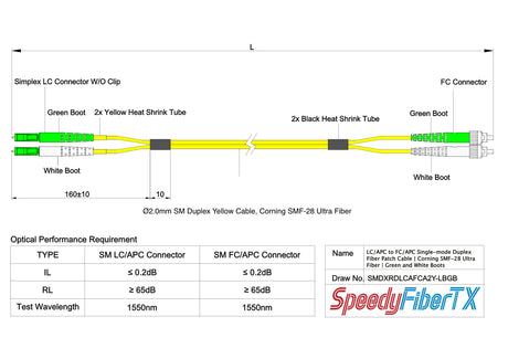 電信級 0.2dB 單模雙工 LC/APC to FC/APC 光纖跳線 | 康寧纖芯 | 綠白尾套 | OFNR 外被