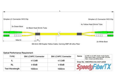 電信級 0.2dB 單模雙工 LC/APC to LC/APC 光纖跳線 | 康寧纖芯 | 綠白尾套 | OFNR 外被