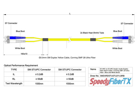 電信級 0.2dB 單模雙工 ST/UPC to ST/UPC 光纖跳線 | 康寧纖芯 | 藍白尾套 | OFNR 外被