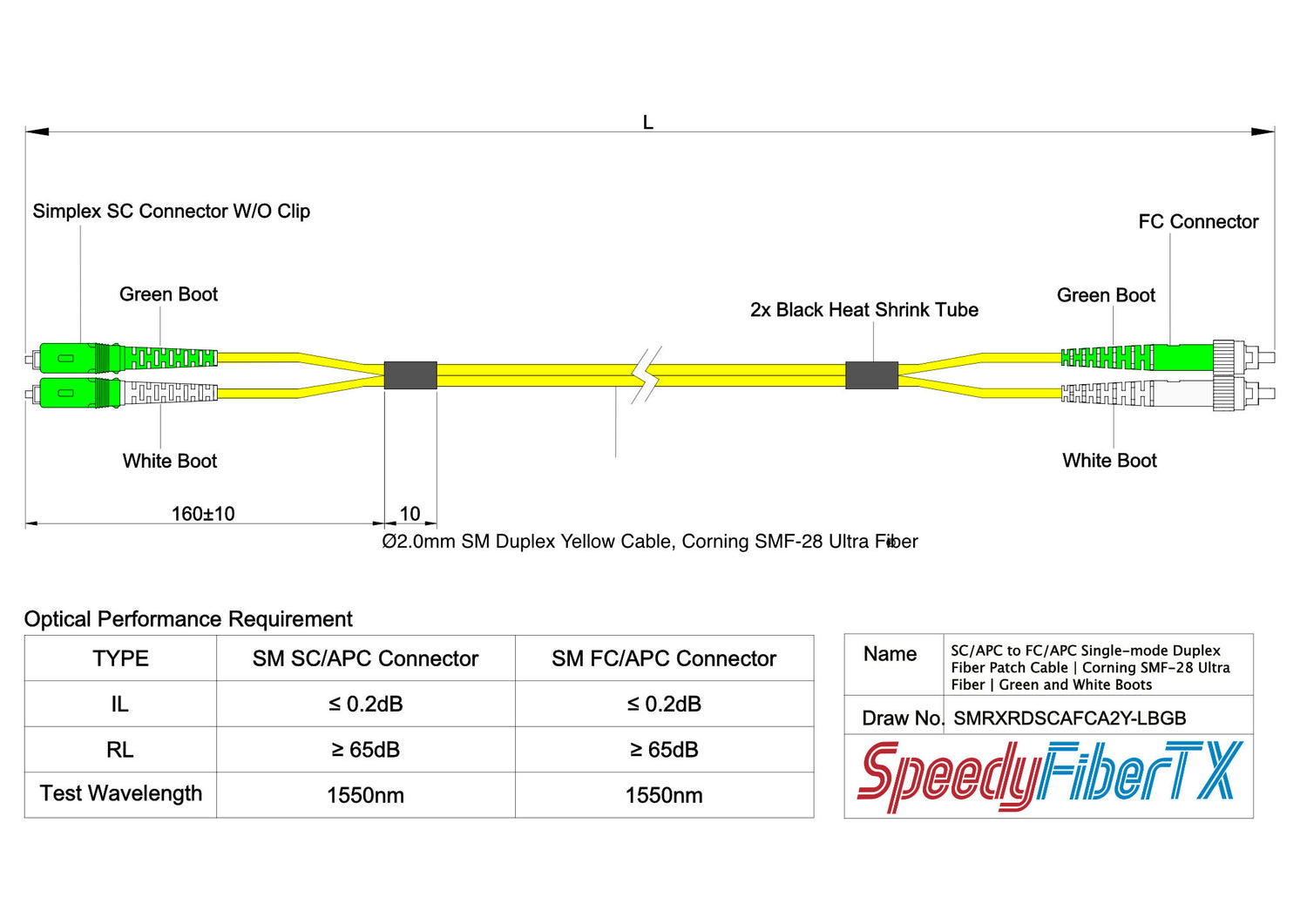 電信級 0.2dB 單模雙工 SC/APC to FC/APC 光纖跳線 | 康寧纖芯 | 綠白尾套 | OFNR 外被