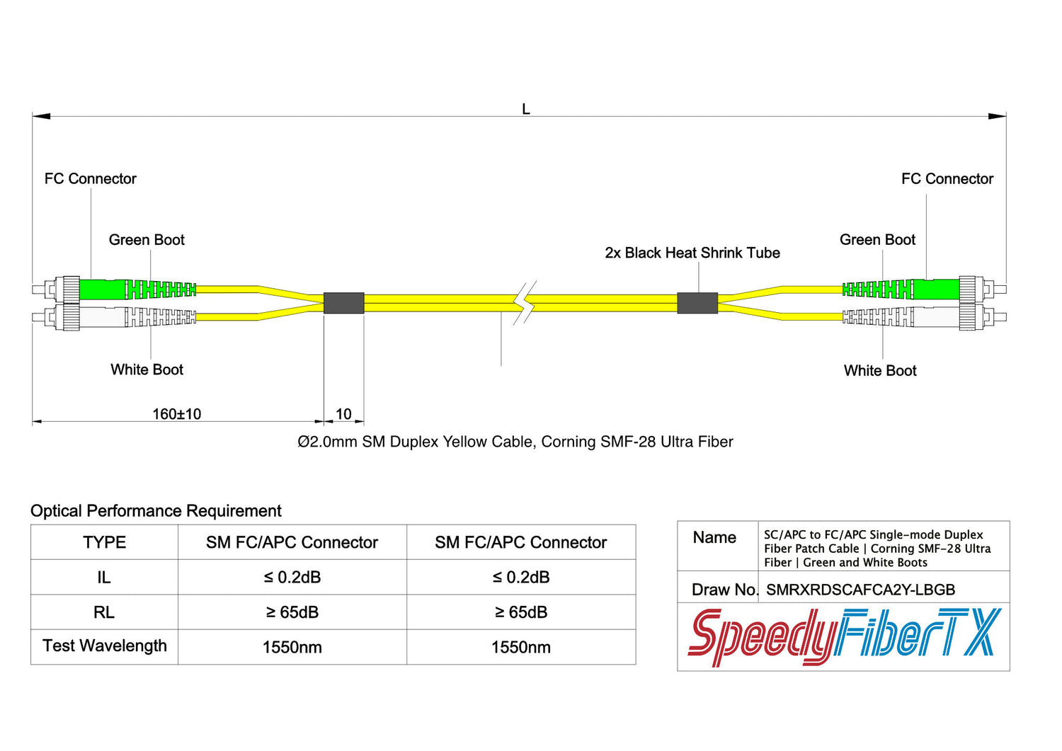 電信級 0.2dB 單模雙工 FC/APC to FC/APC 光纖跳線 | 康寧纖芯 | 綠白尾套 | OFNR 外被