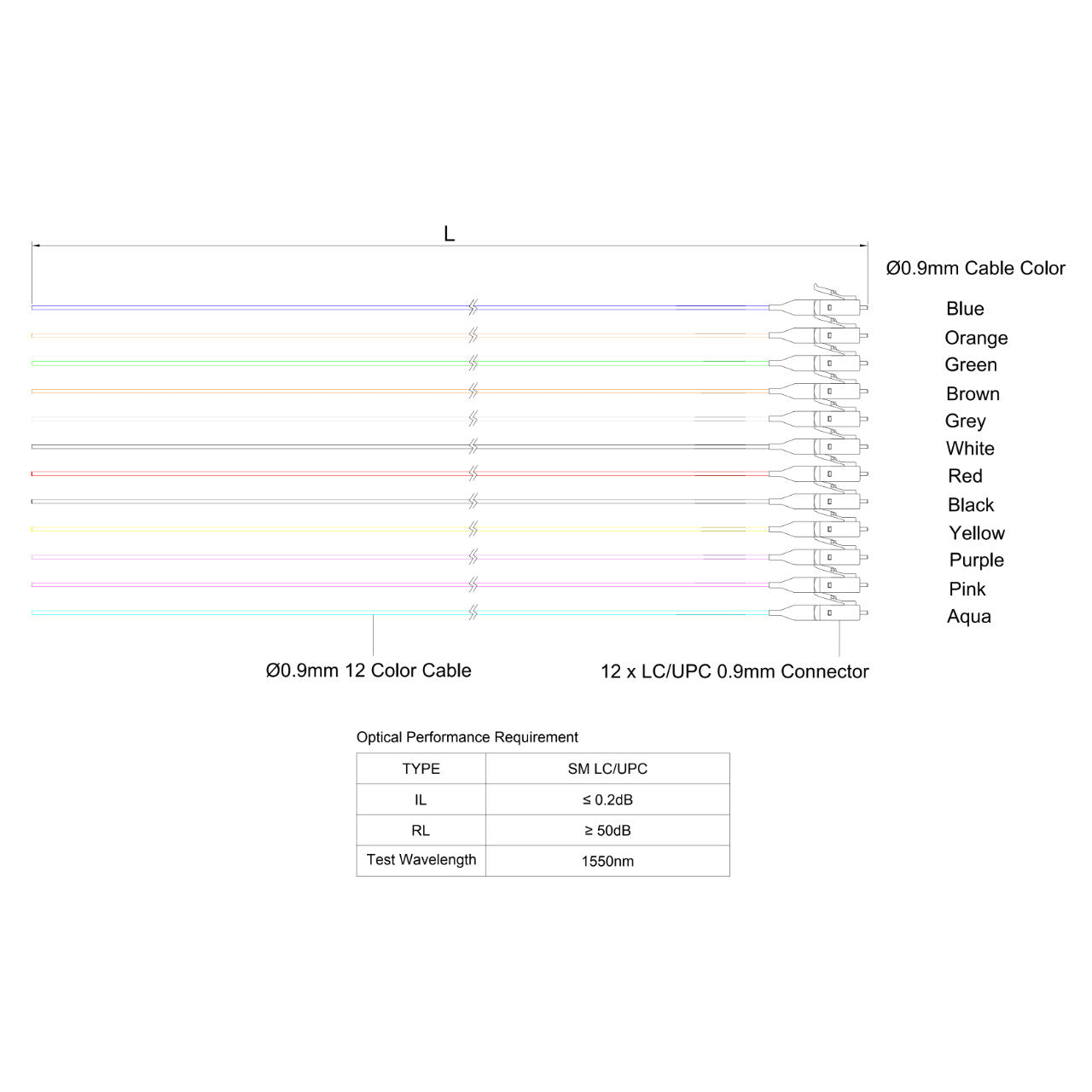 LC/UPC 12-Fiber 900µm Fiber Optic Pigtail | Corning SMF-28 Ultra Fiber | OS1/OS2 Compatible | Single-mode - 1 m has a longer lead time. Please feel free to contact us via chat before placing your order.