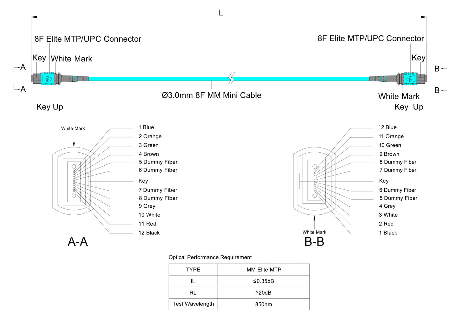 Please note: The US Conec MTP® connectors are fully compliant with the MPO standards, which offer novel patented features, enhanced precision, proven reliability, and significant performance improvements compared to generic MPO connectors.Each MTP®-12 connector is pre-loaded with 8 fibers in positions 1-4 and 9-12, following the standard 8-fiber configuration for parallel optical transmission.