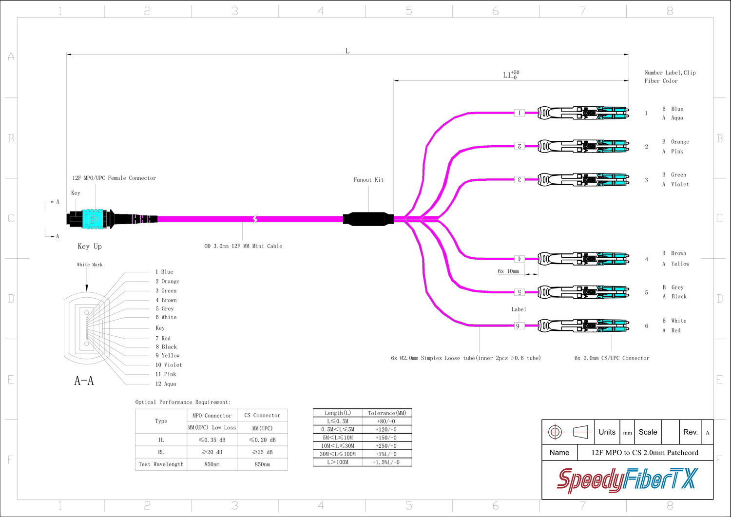 12-Fiber Non-Pinned MPO-12/UPC to 6 x CS/UPC Breakout Cable | Corning® ClearCurve® OM4 Multimode Optical Fiber | Type B, Aqua MPO Connector, Aqua CS Connector, Magenta Cable Jacket | OFNR Jacket has a longer lead time. Please feel free to contact us via chat before placing your order.