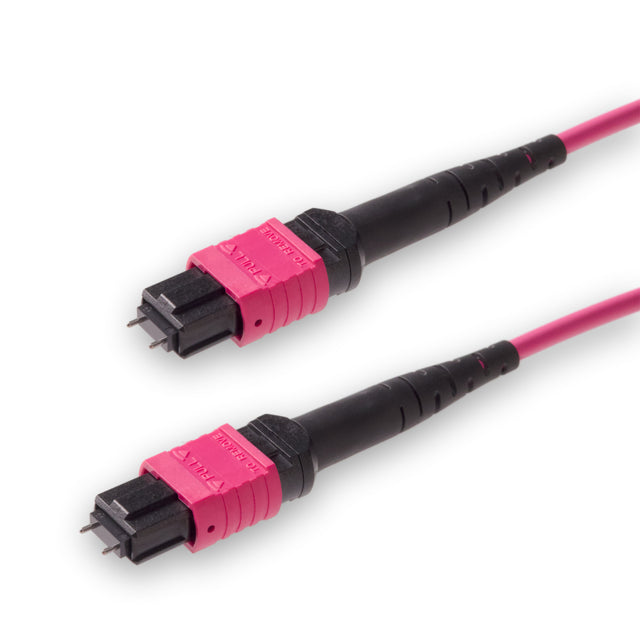 12-Fiber Low Loss Pinned MPO/UPC to Pinned MPO/UPC Jumper | Corning® ClearCurve® OM4 Multimode Optical Fiber | Type A, Magenta MPO Connectors, Magenta Cable Jacket | OFNP Jacket