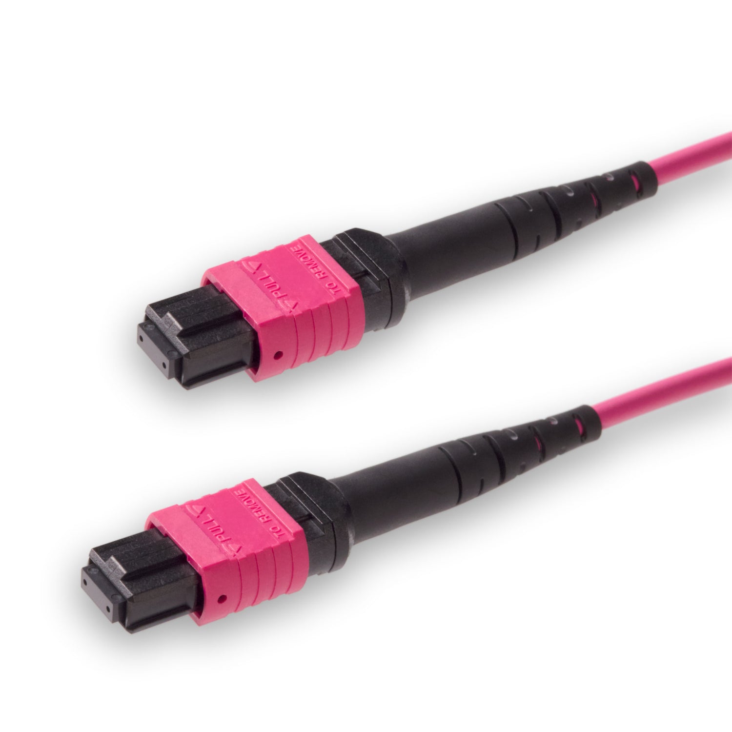 8-Fiber Low Loss Non-Pinned MPO/UPC to Non-Pinned MPO/UPC Jumper | Corning® ClearCurve® OM4 Multimode Optical Fiber | Type B, Magenta MPO-12 Connectors, Magenta Cable Jacket | LSZH Jacket