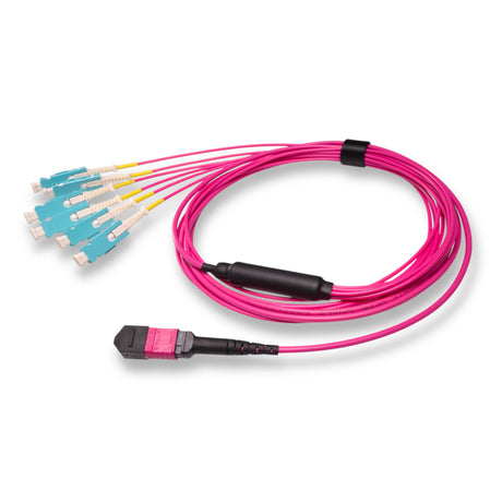 12-Fiber Non-Pinned MPO/UPC to 6 x SN/UPC Fanout Cable | Corning® ClearCurve® OM4 Multimode Optical Fiber | Type B, Magenta MPO Connector, Aqua SN Connector, Magenta Cable Jacket | LSZH Jacket
