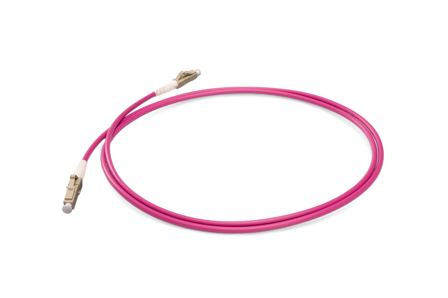 TAA Compliant Fiber Patch Cable | 0.2dB LC/UPC to LC/UPC Multimode OM4 Simplex | Corning ClearCurve OM4 50 µm Laser-Optimized Fiber | Magenta OFNR Jacket, Beige Connectors