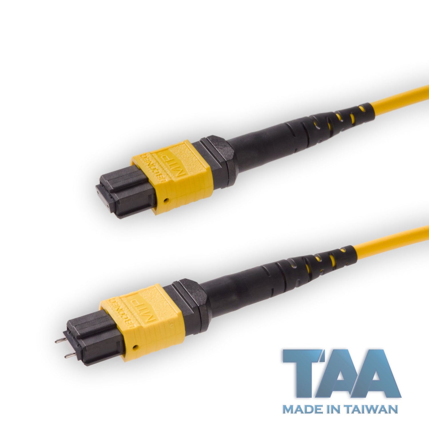 TAA Compliant | 12-Fiber Elite Pinned MTP®/APC to Non-Pinned MTP®/APC Jumper | Corning® SMF-28® Ultra Single-mode Optical Fiber | OS1/OS2 Compatible | Type A, Yellow MTP® Connectors, Yellow Cable Jacket | OFNP Jacket