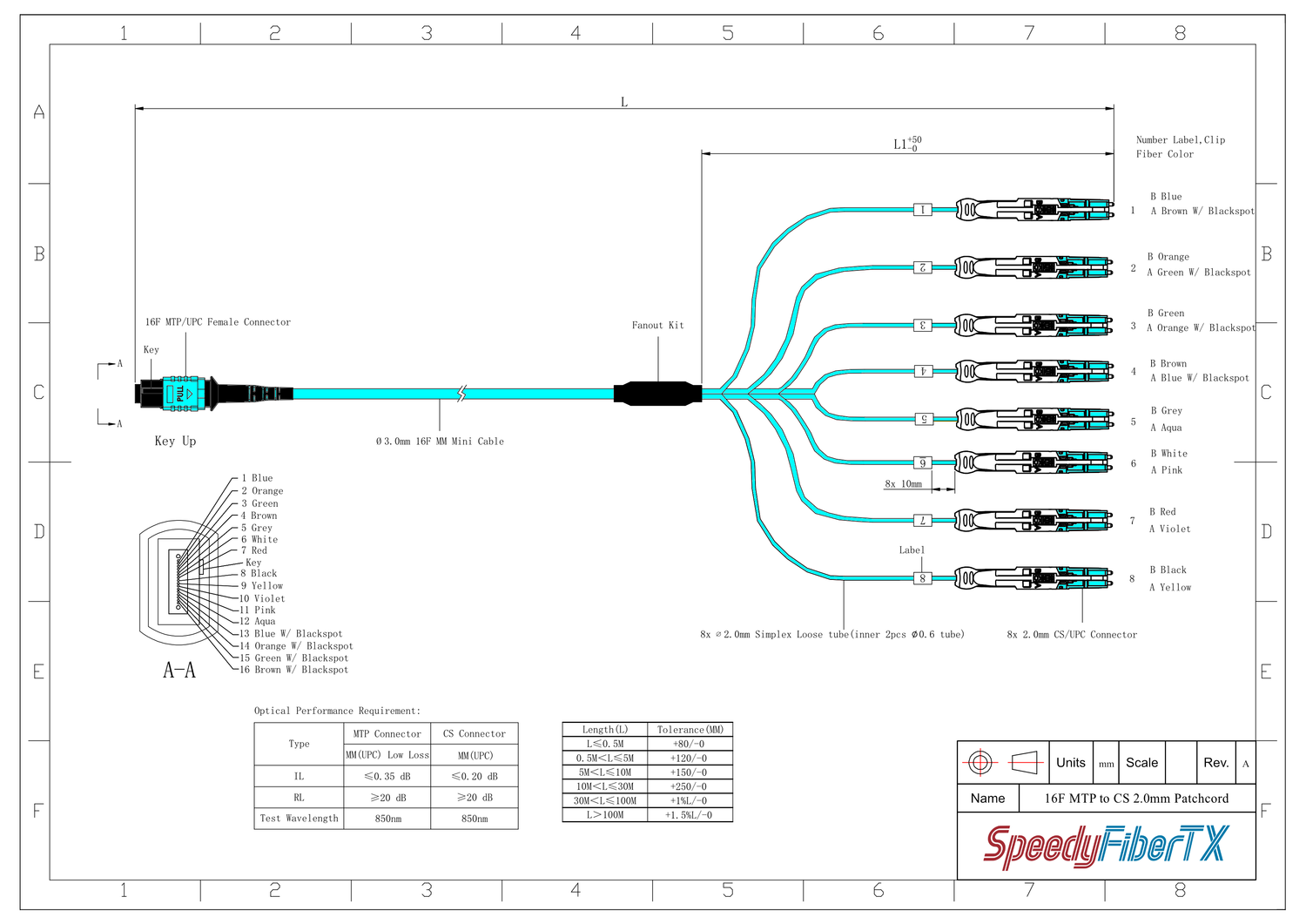 16-Fiber Non-Pinned MTP-16/UPC to 8 x CS/UPC Breakout Cable | Corning® ClearCurve® OM3 Multimode Optical Fiber | Crossover, Aqua MTP Connector, Aqua CS Connector, Aqua Cable Jacket | LSZH Jacket has a longer lead time. Please feel free to contact us via chat before placing your order.