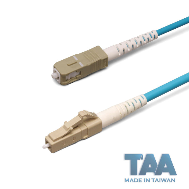 TAA合規 | 電信級 0.2dB LC/UPC to SC/UPC 多模 OM4 單工光纖跳線 | 康寧纖芯 | 水綠色 OFNR 外被, 米色接頭