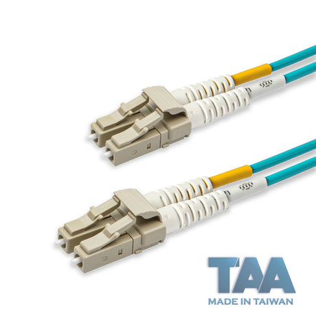 TAA合規 | 電信級 0.2dB LC/UPC to LC/UPC 多模 OM3 雙工光纖跳線 | 康寧纖芯 | 水綠色 OFNR 外被, 米色接頭