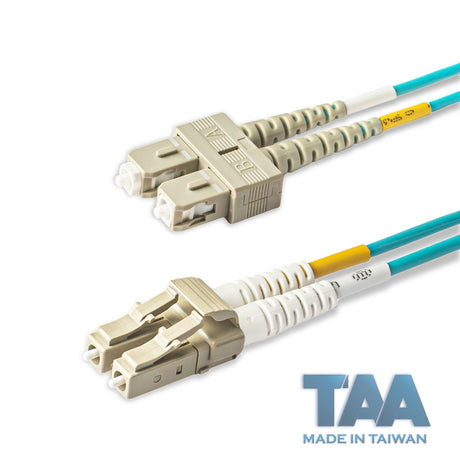 TAA合規 | 電信級 0.2dB LC/UPC to SC/UPC 多模 OM3 雙工光纖跳線 | 康寧纖芯 | 水綠色 OFNR 外被, 水綠色接頭